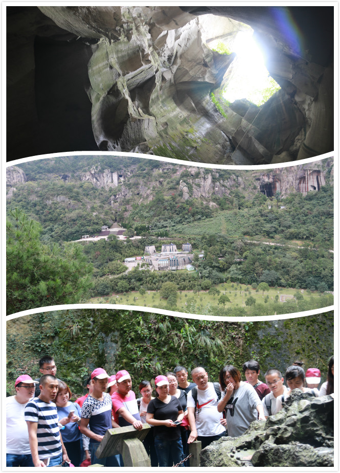 我們來到長嶼硐天,逃離了城市喧囂,行云流水般的舒緩節(jié)奏慢慢上演。望著南北朝以來人工開采石板后形成的石文化景觀,不禁感嘆人類的偉大。據(jù)導游介紹,這里歷經(jīng)1500余年,共鑿出了28個硐群,1314個硐體。隨后,我們參觀了石園、四龍九曲含珠橋、彌勒佛像、巖硐音樂廳、欣賞亞洲唯一的自然巖硐音樂,還有水滴石錢、懸空井、觀音壁等。