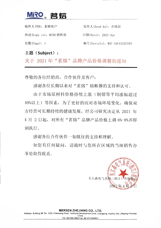 2021年茗熔品牌產(chǎn)品漲價(jià)通知