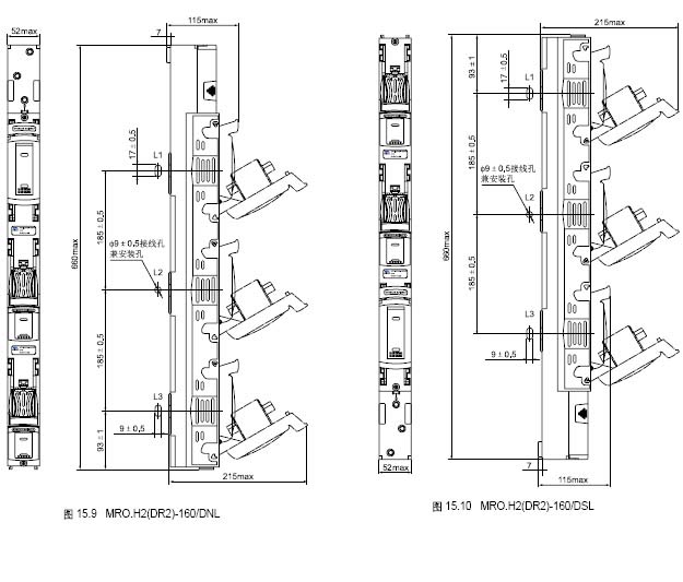 開關(guān)由底座和罩殼( 載熔裝置) 兩部分組成,呈三相封閉式 結(jié)構(gòu),正面操作,通過罩蓋上的透明板,可以直接觀察配裝的熔 斷體額定數(shù)據(jù)及指示件動作狀態(tài)。 開關(guān)安裝方式:開關(guān)實施模塊化設(shè)計。MRO.H2(DR2)-160/L 寬度為52mm,利用開關(guān)的進(jìn)線可以直接安裝在185mm 的母排 系統(tǒng)上,分為上出線或下出線二種型式,可三極同時分合,也可 三相單獨分合,可以配裝尺碼為000 或00 任一種熔斷體。 MRO.H2(DR2)-400/MRO.H2(DR2)-250 寬度為102mm,利 用開關(guān)的進(jìn)線可以直接安裝在185mm 的母排系統(tǒng)上,也可以利 用二個12x18 的安裝孔固定在支架上,二種安裝方式都具有上出 線或下出線二種型式,可三極同時分合,也可三極單獨分合,配 裝尺碼為1 或2 的熔斷體;MRO.H2(DR2)-630 寬度為102mm, 利用開關(guān)的進(jìn)線可以直接安裝在185mm 母排系統(tǒng)上,也可以利 用二個12x18 的安裝孔固定在支架上,二種安裝方式都具有上出 線或下出線二種型式,可三極同時分合,也可三極單獨分合,配 裝尺碼為3 的熔斷體; 開關(guān)具有占用安裝空間小、使用安全可靠、熔斷體裝卸方便、 操作力小等優(yōu)點。