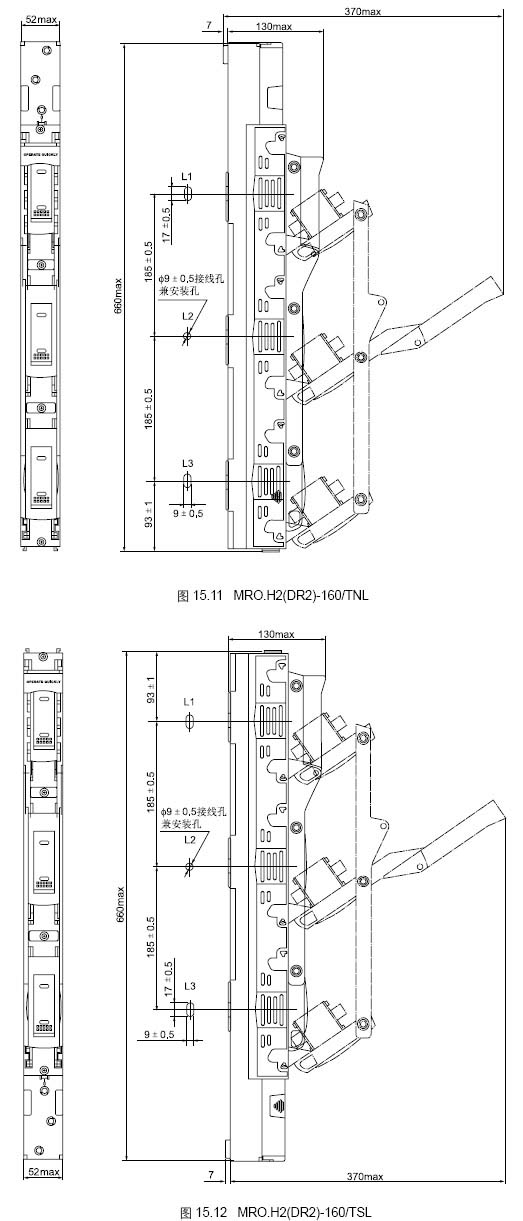 開(kāi)關(guān)由底座和罩殼( 載熔裝置) 兩部分組成,呈三相封閉式 結(jié)構(gòu),正面操作,通過(guò)罩蓋上的透明板,可以直接觀察配裝的熔 斷體額定數(shù)據(jù)及指示件動(dòng)作狀態(tài)。 開(kāi)關(guān)安裝方式:開(kāi)關(guān)實(shí)施模塊化設(shè)計(jì)。MRO.H2(DR2)-160/L 寬度為52mm,利用開(kāi)關(guān)的進(jìn)線可以直接安裝在185mm 的母排 系統(tǒng)上,分為上出線或下出線二種型式,可三極同時(shí)分合,也可 三相單獨(dú)分合,可以配裝尺碼為000 或00 任一種熔斷體。 MRO.H2(DR2)-400/MRO.H2(DR2)-250 寬度為102mm,利 用開(kāi)關(guān)的進(jìn)線可以直接安裝在185mm 的母排系統(tǒng)上,也可以利 用二個(gè)12x18 的安裝孔固定在支架上,二種安裝方式都具有上出 線或下出線二種型式,可三極同時(shí)分合,也可三極單獨(dú)分合,配 裝尺碼為1 或2 的熔斷體;MRO.H2(DR2)-630 寬度為102mm, 利用開(kāi)關(guān)的進(jìn)線可以直接安裝在185mm 母排系統(tǒng)上,也可以利 用二個(gè)12x18 的安裝孔固定在支架上,二種安裝方式都具有上出 線或下出線二種型式,可三極同時(shí)分合,也可三極單獨(dú)分合,配 裝尺碼為3 的熔斷體; 開(kāi)關(guān)具有占用安裝空間小、使用安全可靠、熔斷體裝卸方便、 操作力小等優(yōu)點(diǎn)。