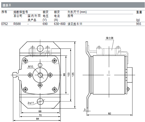 由純銀片制成的變截面熔體封裝于由高強度瓷制成的熔管內;熔管中充滿經化學處理過的高純度石英砂作為滅弧介質;熔體二端采用點焊與觸頭牢固電連接。熔斷體型式有方管刀形觸頭和方管平板形觸頭兩種。熔斷體可帶指示器或撞擊器,當熔體熔